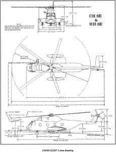 The HH-3E is 72 feet, 7 inches (22.123 meters) long and 18 feet, 10 inches (5.740 meters) high with all rotors turning. The main rotor has five blades and a diameter of 62 feet (18.898 meters). Each blade has a chord of 1 foot, 6.25 inches (0.464 meters). The main rotor turns at 203 rpm., counter-clockwise, as seen from above. (The advancing blade is on the right.) The tail rotor also has five blades and has a diameter of 10 feet, 4 inches (3.150 meters). The blades have a chord of 7–11/32 inches (0.187 meters). The tail rotor turns clockwise as seen from the helicopter’s left (the advancing blade is below the axis of rotation). The tail rotor turns 1,244 rpm.