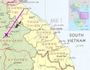 With the men safely on board, the next problem was getting out of there. Butchka did not want to go back out the way he came because of heavy enemy fire. Weather was hot and humid, pressure altitude was high, and the only other way out presented him with a vertical face rising about 130 feet. It was decision time. Butchka said; “I headed for the face, pulled every bit of power I could (‘pulled the collective to my arm pit’ was the description in another interview), and with a little bit of airspeed drooped the rotor to 94-percent — and just cleared the top.” As he eased over the ridgeline, the JOLLY immediately came under heavy ground fire from a different direction. SANDY lead hadn’t reported anything because he didn’t know where Butchka was. Miraculously they were not hit. However, JOLLY 04 “caught his blades in some trees and is requesting escort out of the area.” A forward air controller, COVEY 297, escorted JOLLY 04 to Lima Site 61, an Air Force TACAN navigation site at Muang Phalan, Laos.